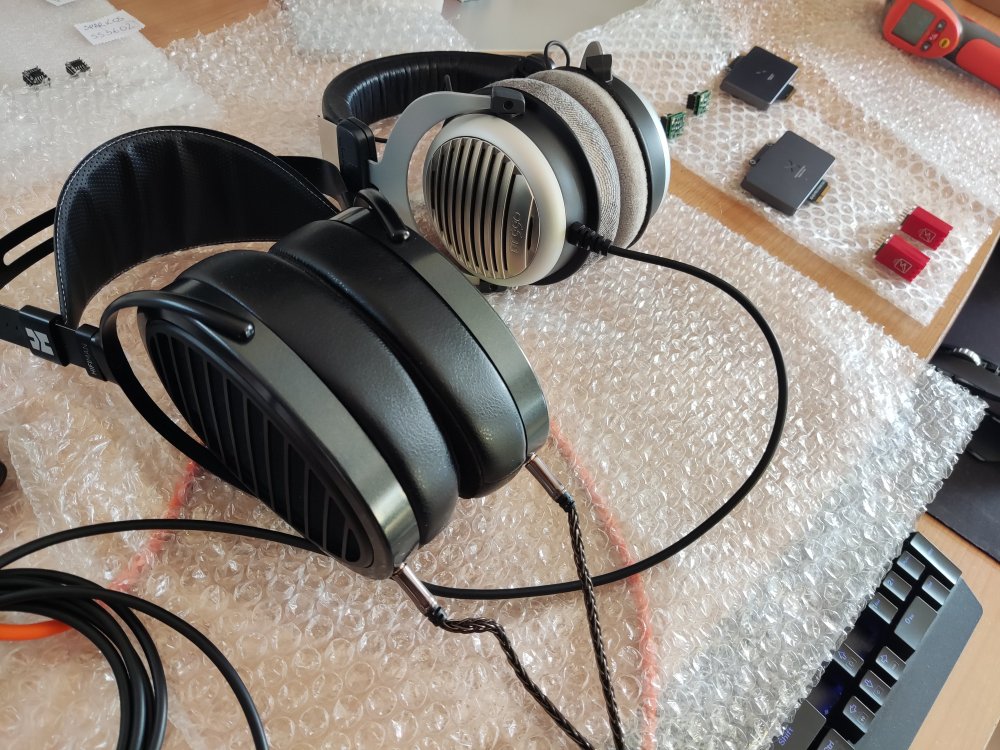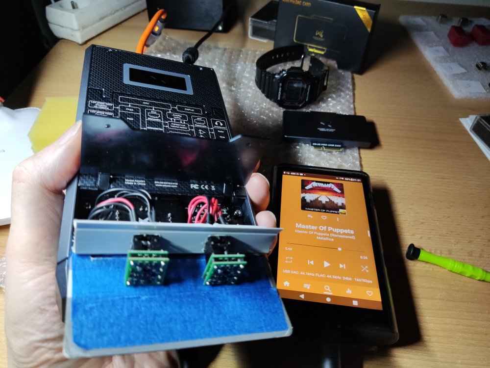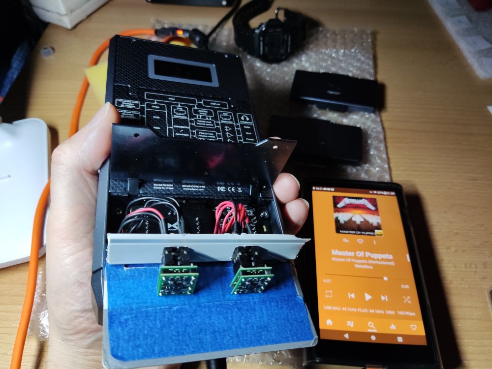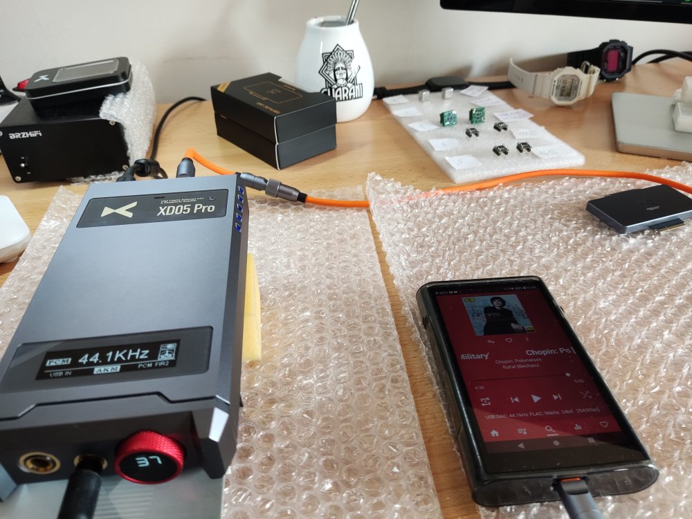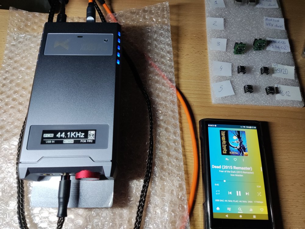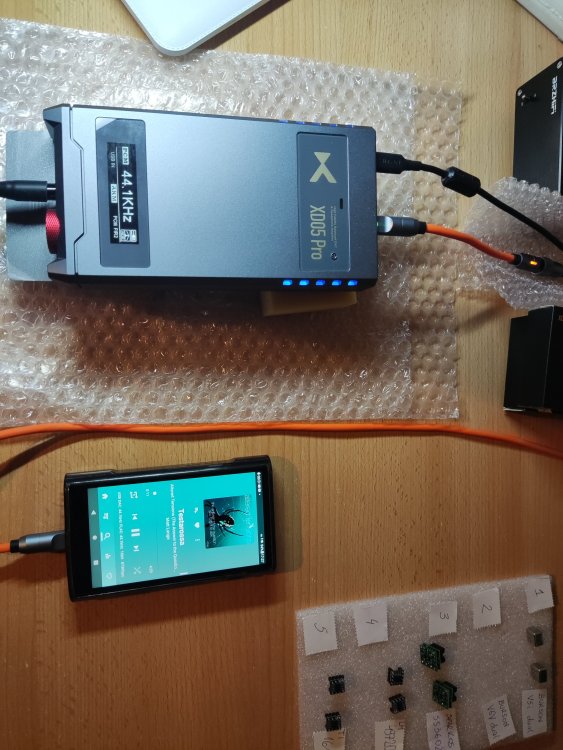 Dzięki uprzejmości Johna z Burson Audio miałem okazję przetestować wzmacniacze Burson V6 Vivid Supreme Sound z Xduuo Xd05 pro. Plusy: Wysoka dynamika, detaliczny dźwięk, wyrównane granie, szeroka scena, ładny wygląd. Minusy: Dość wysokie obudowy - nie mieszczą się w Xd05 pro bez przejściówek ale to raczej minus dla Xduuo, że nie wymyślił montowania wzmacniaczy od góry przez okienko. Chociaż i tak dobrze, że to się da jakoś obejść. Na chwilę obecną posiadam takie wzmacniacze: · Burson Audio Supreme Sound V5i Dual · Burson Audio Supreme Sound V6 Vivid Dual · Sparkos Labs SS3602 Dual oraz dołączone do zestawu z Xd05 pro · LME49720MA · Ti OPA1612A * * Wszystkie te wzmacniacze są w wersji dual dlatego też będę używał w dalszym opisie skróconej nazwy bez "-D". Zostały one zakupione z oficjalnej dystrybucji (SS2602 od Sparkos z USA, Burson V5i od polskiego oficjalnego dystrybutora) Mam 2 dodatkowe moduły DAC (oprócz oczywiście dostarczonego fabrycznie ESS): · AKM (na układzie AK4499EX) · ROHM (na układzie BD34301EKV) Wyżej wymienione komponenty powodują wiele możliwych konfiguracji. Do odsłuchu użyłem słuchawek Hifiman Arya stealth magnets na przewodzie zbalansowanym (Openheart 16 żył, 8 par, posrebrzana miedź, 2m). Uważam, że gniazdo 4.4 mm daje więcej wrażeń - scena i detaliczność jest większa. Łatwiej jest wyłapać różnice w dźwięku. Podłączyłem też Bayerdynamic DT 990 pro (600 Ohm, przewód fabryczny single ended), gra to nieźle - lekko, zwiewnie, ze znacznie mniejsza ilością basu, przestrzeni. Sprawdza się to połączenie przede wszystkim w muzyce wokalnej. Pokrętło głośności trzeba znacznie przekręcić w prawo (ok. 20-25 więcej) by uzyskać tą samą głośność co z Arya. Testy wykonywałem na średnim wzmocnieniu Xd05 pro (niebieskie diody LED). Na tym poziomie wzmocnienia wydaje mi się, że Arya najlepiej się sprawują. Xd05 pro zasilany jest stałym napięciem 12V z zasilacza liniowego (BRZHiFi). Do testów zastosowałem własny zestaw DIY (do montażu op-amp) składający się z 4 sztuk przejściówek DIP-8 z przylutowanymi przewodami i plastikowego wspornika zamontowanego do Xd05 pro służącego do ich stabilnego zamontowania. Gniazda DIP-8 na wsporniku są zamontowane na wcisk i przyklejone klejem na gorąco (od strony przewodów). Prócz tego aby nie zrobić przypadkiem jakiegoś zwarcia użyłem przekładki ze starej plastikowej karty kredytowej aby przypadkiem nie dotknąć op-amp (szczególnie tych z elektroniką bez obudowy, jak np. SS3602). Szkoda, że Xduuo konstrukcyjnie nie przewidziało montowania większych gabarytowo wzmacniaczy (np. przez okienko od góry) ale dzięki odrobinie inwencji, jak widać można sobie z tym poradzić, tylko jest to mało eleganckie. Zacznę od pierwszych wrażeń z odsłuchu Burson V6 Vivid. Po pierwsze początkowo rzuca się w uszy ponadprzeciętna dynamika, klarowność przekazu, poukładana scena, tony średnie, wokale nie są wycofane, (w porównaniu z innymi op-amp, np. SS3602). Na tym można by zakończyć ale z natury lubię niestety za bardzo wchodzić w szczegóły dlatego w dalszej części postaram się przekazać swe odczucia w porównaniu z innymi posiadanymi wzmacniaczami (op-amp) i jak te wzmacniacze sprawują się z różnymi DAC. Mnogość kombinacji spowodowała, że wiązało się to z wielokrotnym przekładaniem wzmacniaczy jak i modułów DAC. Dlatego ważne jest żeby zestaw do zamontowania wzmacniaczy był wykonany stabilnie jak również należy zachować szczególną ostrożność przy wyjmowaniu/wkładaniu podzespołów żeby niczego nie uszkodzić. Testy przeprowadzałem na słuchawkach na wyjściu zbalansowanym. Podłączałem też Arya fabrycznym kablem do gniazda 6.35 mm ale wg mnie dużo lepsze rezultaty (scena, szczegóły) oferuje gniazdo 4.4 mm. Jako źródło użyłem DAP Shanling M6 Ultra (sygnał podawany przez USB). Korzystałem na DAP z aplikacji USB audio player pro (UAPP – w ustawieniach zaznaczone bit perfect mode) z Tidal. Starałem się używać najwyższej dostępnej jakości plików. Na początku kilka ogólnych porównań. Nie obejdzie się jednak na samym zrecenzowaniu V6 Vivid. Wydaje mi się, że trzeba by też wtrącić porównania z innymi posiadanych op-amp i jak one wszystkie wypadają w połączeniu z trzema modułami DAC. Wtedy będzie szerszy obraz całości. Ogólne porównywanie wzmacniaczy Burson V5i vs Burson V6 Vivid Starszy model wydaje się mieć to samo DNA. Dźwięk z V5i wydaje się być mniej dynamiczny, trochę mniej szczegółowy, z mniejszą sceną. Burson V6 Vivid jest udoskonalonym wzmacniaczem oferującym przede wszystkim większą dynamikę, szerszą scenę, ponadprzeciętną szczegółowość. Powinni na niego postawić Ci którzy cenią sobie technikę, precyzję, nie wycofane tony średnie. To obowiązkowy wzmacniacz dla miłośników tzw. ciężkiego brzmienia (rock, metal itp.) chociaż nie tylko, bo świetnie sobie radzi w wielu rodzajach muzyki ale we wcześniej wymienionym gra genialne (szczególnie z DAC ROHM, ESS). Burson V6 Vivid vs Sparkos SS3602 Ten pierwszy ma lepszą dynamikę, bardziej wyraziste wokale. Sparkos wydaje się grać bardziej V-ką, średnie tony na Sparkos są nieco cofnięte. Nie jest to wg mnie układ dla wielbicieli mocnego brzmienia - bardziej nada się dla wielbicieli innych gatunków (np. muzyki instrumentalnej, jazzu). Wydaje mi się, że Sparkos lepiej prezentuję tę miękkość z DAC AKM ( przez nieco cofnięte tony średnie) posiadanie większej ilości niskiego basu. Inaczej też Sparkos buduje scenę. Lepiej gorzej, trudno to ocenić. LM49720 vs Ti1612 Co do dołączonych do Xd05 pro wzmacniaczy - grają dobrze, może oferują trochę mniej. Ogólnie bez wchodzenia w szczegóły układom tym trochę brakuje względem Burson czy Sparkos. Wzmacniacze LM49720 grają w liniowy sposób, z węższą sceną, z mniejszą ilością basu. Lepie