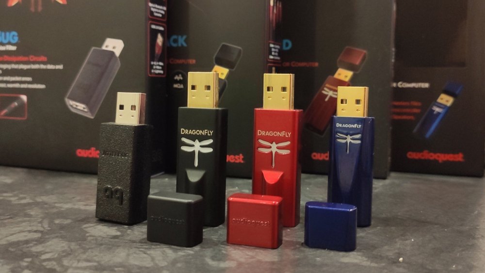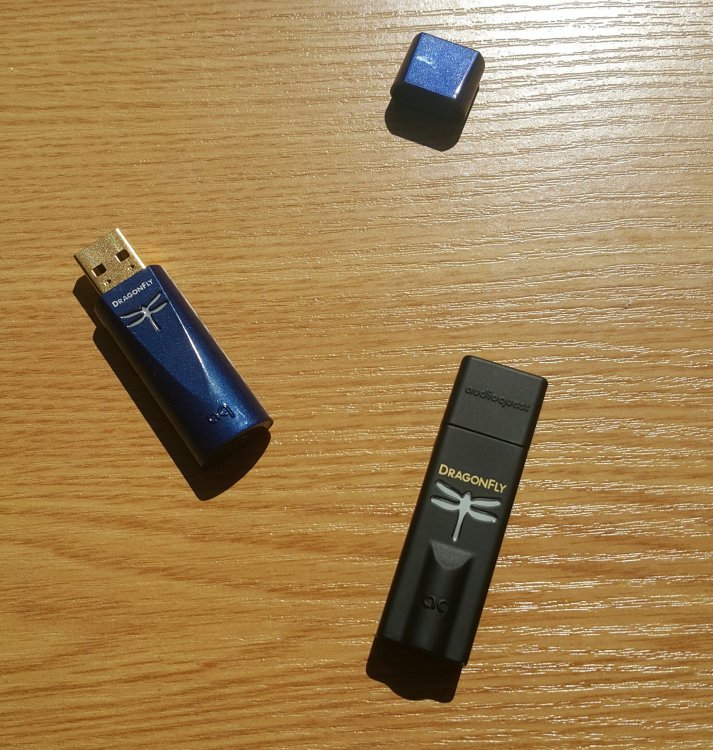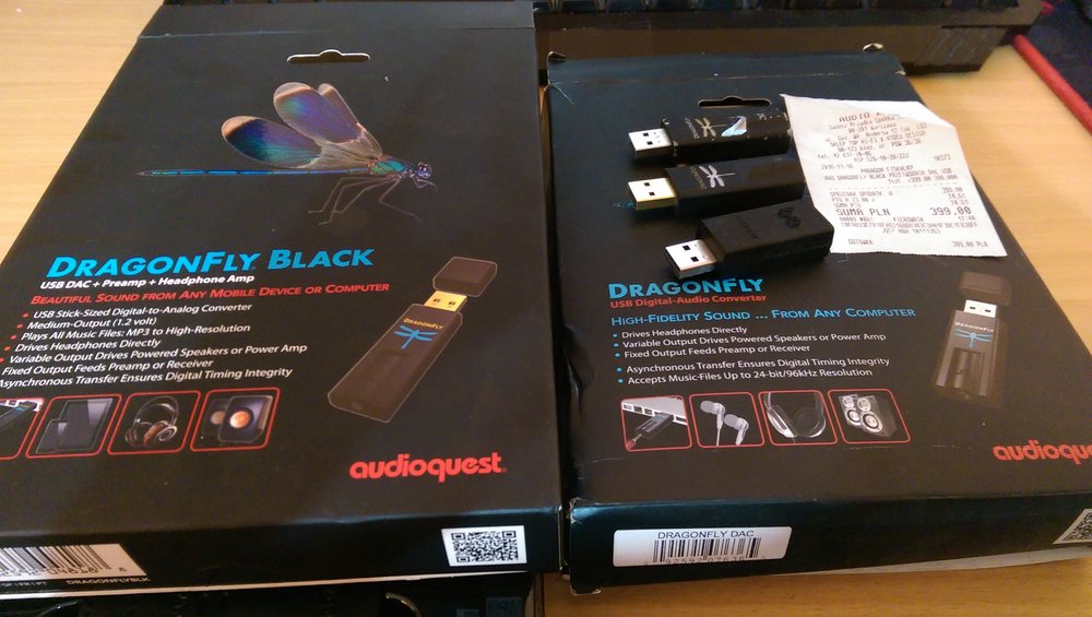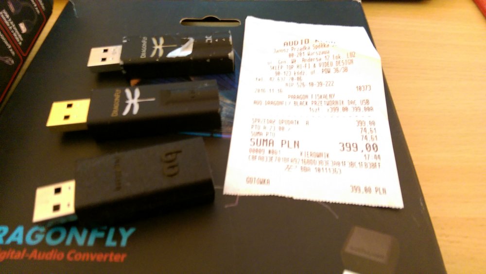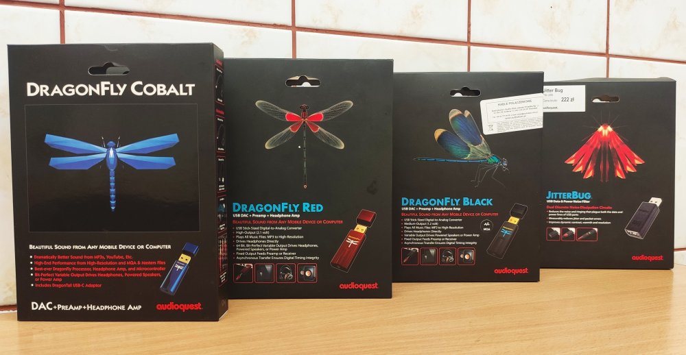 Zamysłem jest porównanie poprzednich produktów i odpowiedź na pytanie "czy warto?". Panowie w szeregu: Bez czapeczek (dzień dobry): Padnij: Męska wtyczka penetrująca żeńskie gniazdko: No dobra Zaczynamy. Dragonfly na dzień dzisiejszy w wersji Red kosztuje 499zł a w wersji Black 250zł. Dodatek w postaci jitterbuga to dodatkowy wydatek 149zł. Dragonfly Cobalt kosztuje łącznie tyle co: Dragonfly Red Dragonfly Black jitterbug 0,7 burbonu Bilety do kina dla dwóch osób + drogi popcorn i woda niegazowana nie z lodówki x2. 0,7 czarnego rumu Jamajskiego 2 nowe płyty CD 0,7 koniaku dobrego gatunku guma kulka --------------------------- 1333zł Co za to dostajemy? Pudełko Przetwornik kabel hosta USB C Urządzenie poprawnie pracuje na windowsie, androidzie i systemie playstation 4 - innych urządzeń niestety nie udało mi się zorganizować. Na windowsie klasyka - podłączamy i działa (jedyne zastrzeżenie to wymuszone 24bity - trochę nie audiofilsko) Na androidzie jeżeli skorzystamy na dokanałówkach domyślnego odtwarzacza to nam urwie uszy USB Player Pro przy ustawieniu "hardware volume" działa jak malina. PS4 - jak zwykle gra ale cicho. Potrzebujemy ciszy w domu aby grać. Przetwornik ma ważkę która świeci kolorami tęczy jak poprzednie dragonflaje. Przy używaniu na różnych systemach nie występują żadne kłopoty jak przerywania, trzaski, pierdy i piski. Platforma porównawcza: słuchawki: nauszniki niemodyfikowane: Hifiman Sundara Creative aurvana live! Kef Space One Wireless - po kablu Xiaomi mi comfort Logitech G433 Dokanałówki/douszne: Aune e1 Apple earpods Apple in-ear Sony mdr-nc750 Creative aurvana in-ear Sony mh1c Komputer: stacjonarny win10 tablet win10 (toshiba encore) na obu urządzeniach zainstalowany winyl player (wasapi) Konsola: ps4 slim telefon: Xiaomi mi 9T Utwory tidal/flac/mp3: Beats Antique - Roustabout The Seventh Sons - Secrets The Cadillac Three - Demolition Man Nicki Bluhm - To Rise You Gotta Fall Tami Neilson - Bananas Sugarland - On a Roll Montgomery Gentry - Shotgun Wedding Morgan Wallen - Little Rain The Dirty River Boys - Cheyenne Lumsk - Trolltind Rob Zombie - Teenage Nosferatu Pussy Rotting Christ - Cine Iubeste Si Lasa IXXI - Original Sin Marek Grechuta - W dzikie wino zaplątani Diablo Swing Orchestra - Climbing The Eyewall Rimski-Korsakov: Piano trio in C minor: Allegro Assai Bach: Violin Concerto No. 1 in A Minor, BWV 1041: II. Andante The Prodigy - Wall Of Death Yoshiko Kishino - Antonio's Song Pink - Hustle Po wygrzaniu (77h ciągłego grania na różnych słuchawkach) można zauważyć znaczące zmiany w przepoczwarzaniu charakteru tonalnego. Z nieco ostrego, siarczystego z cyfrowym polotem na przełomie średnicy i wysokich ...stał się ciemnym, ciepłym, spokojnym i nieangażującym. Kto zna brzmienie 9038 w wersji mobilnej, ten może odnaleźć w Cobalcie wzmożony spokój w porównaniu do innych aplikacji. Różnica jest znaczna w stosunku do urządzenia prosto z pudełka. Bas: Urządzenie ma wyraźną linię basową podbitą w subbasie i wyższych jego rejestrach. Na szczęście nie przechodzi to w niższą średnicę. Bas jest suchy i bez jakiegoś większego charakteru. Szybkość i atak stoją tu conajmniej na przeciętnym poziomie. Barwa zalatuje trochę pudełkowością przez co instrumenty brzmią trochę sztucznie. Kolanko nie podskakuje. Średnica: Tu w sumie dzieje się najwięcej, lub można by rzec że średnica to córusia tatusia tego testu. Cóż - córka o kontrowersyjnej urodzie. Głosy męskie i żeńskie poprzez taką niewymuszoną organiczność brzmią atrakcyjnie a przez delikatne przygaszenie są nieco oddalone. Dzieje się tu całkiem sporo i to właśnie średnicą czuć scenę - która jest dosyć szeroką elipsą (sabrowskie granie na boki). Nie jest to może granie równe bo mamy tu delikatne podbicie w średnich średnich. Wysokie: Jeżeli lubisz wsłuchiwać się w sola perkusyjne, dzwoneczki, przeszkadzajki i inne mikroplanktony - to Cobalt nie jest dla Ciebie Soprany grają bardziej niż typowo dla es9038 - grają mocno w tle, a linia perkusyjna odbywa się na przełomie średnich i wysokich. Nawet iskrzące radością KEFy Space One - były wykastrowane z góry. Wg wiarygodnych źródeł lekko od 7khz a ostro od 10khz !!!. Przesadnie jasne Mi Comfort grały po prostu matowo bez życia. Może ktoś tak lubi. Mimo wszystko kameralne małe aranżacje jazzowe brzmiały całkiem przyjemnie, choć brakowało pełnego rozciągnięcia na górze. Boli mnie serce i portfel jak mam porównywać do Reda i Blacka. Cieszyłem się na to porównanie jak dziecko aż ciasto ostygnie. Ostygło ale jest z bananami - a ja bananów nie lubię - nawet nie pomogło zastosowanie cukru w postaci jitterbuga. -------------- Red jest bardziej równy i z dużo ładniej rozciągniętą góra. Gra bardziej angażująco i szybciej a z jitterbugiem jeszcze lepiej. Black jest bezpieczniejszą wersją Reda bez fajerwerków i jeśli chodzi o granie liniowe to również jest bezpieczniejszy niż Cobalt, choć czuć że mimo takich zabiegów koloryzujących Cobalt jest bardziej wyrafinowanym w całokształcie niż czarny (ale czy bardziej niż Red?) Obiektywnie - Dragonfly Cobalt powinien kosztować tyle samo co Red i stanowić wybór w charakterze dźwięku. Mam nadzieję że tak jak ja liczyliście na coś innego...