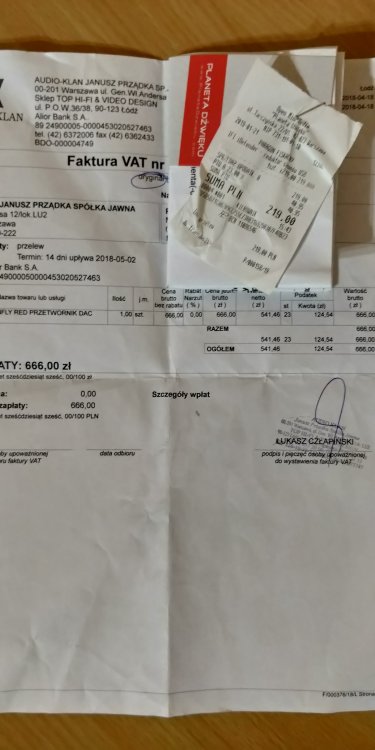Nazbierało mi się trochę niepotrzebnego sprzętu, wszystko leży i się kurzy. Póki co nie wrzucam zdjęć, temat będe aktualizował, bo nad niektórymi sprzętami (ts671) muszę się jeszcze zastanowić ISK HP-580 - zamieniłem na próbę z Perulem, u niego pograły kilkanaście godzin, u mnie też kilka dni bo mi średnio podeszły. Wymieniłem w nich opaskę na wingsy z superluxów 668b. Słuchawki mają też wstawione gniazdo 3,5mm, stąd cena 60zł. ASUS Xonar DG - komplet, cena 75zł z wliczoną wysyłką. sprzedany Hifiman HE350 - słuchawki w stanie idealnym, odkupione praktycznie nowe, u mnie pograły z 50 godzin. Pady jak nowe ale i tak polecam wymianę, bo są twarde. Polecam hydrydy lub skórzane hm5. Cena 250zł. sprzedane Audioquest Dragonfly 1.0 - świetny dac, choć brzydki i odrapany z farby to wciąż działa bez zarzutu, używam na zmianę z 1.5 i mam dylemat który lepszy Używany już dłuższy czas, cena zakupu z 2012 powala Dźwiękowo 1.0 odrobinę ostrzejszy na średnicy ale to wciąż lekko jasne, gładkie brzmienie. Miałem wersje 1.2 która mi podeszła najmniej z całej trójki. Wersja 1.0 ma wyraźnie więcej mocy niż black, by uzyskać tą samą głośność co 1.0 przy 65-70% w windowsie wersje black trzeba ustawić na 90%. Tutaj jestem otwarty na propozycje zamiany 1.0 lub 1.5 za Reda z dopłatą bo czytałem, że dla wielu jest zbyt jasny. Cena 180zł, w tej cenie wg mnie nie ma konkurencji. sprzedany Audioquest Dragonfly 1.5 Black - na gwarancji do 16.11.2018r. Cena 300zł sprzedany Audioquest Jitterbug - kupiłem nowy w lutym 2018, cena 90zł. sprzedany Polecam zakup Dragonfly razem Jitterbugiem, w przypadku zakupu łącznie dam dodatkowy rabat. PS. Pytacie o gwarancje itp. Sprzęty są po gwarancji lub jej nie mają (Hifiman kupione przez Massdrop), dla pewności wystawiłem je również na allegro. Przed zakupem na allegro prosiłbym napisać wcześniej, że z forum i wtedy jest inna rozmowa, darmowa wysyłka itd.