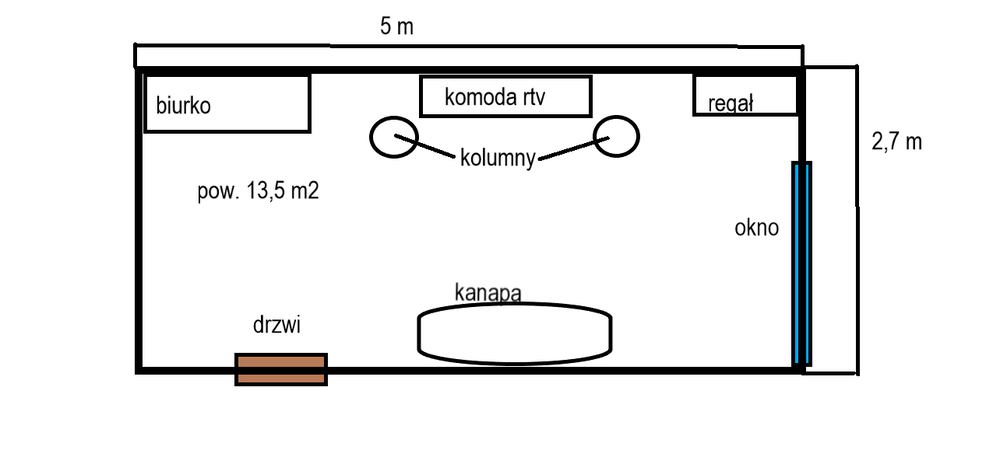 Cześć! Poszukuję audio do TV Samsunga UE55MU6402. Pokój ok. 22m2, odległość do telewizora jakieś 4m. W tej chwili interesuje mnie tylko stereo 2.0. Jeżeli się nie mylę, to będzie to amplituner i dwa głośniki frontowe. Mój budżet wynosi max. 2000 zł. Jeżeli uda się ogarnąć to taniej, to jeszcze lepiej, i tak na początku planowałem wyrobić się w 800 zł, więc nie mogę dołożyć ani złotówki ponad 2k Źródłem dzwięku będzie tak właściwie jedynie TV: telewizja naziemna, przeróżne gatunki muzyki TIDAL/FLAC, Netflix, filmy 4k - muzyka i filmy/programy tv po 50%.Żadnego odtwarzacza płyt nie potrzebuję.Jeżeli głośniki będą węższe niż 17,5 cm, to wysokość nie ma znaczenia. Jeżeli szersze, to nie mogą być za wysokie, bo nie zmieści się między nimi TV i będzie musiał wisieć nad. W obecnym mieszkaniu system 5.1 wykluczam. Dopuszczam używany sprzęt, o ile będzie dostępny "od ręki". Rozmieszczenie TV i głośników zamieściłem na poglądowym zdjęciu PS. Mam Microlaby Solo 6c, ale podejrzewam, że będą za słabe.Serdecznie proszę o pomoc