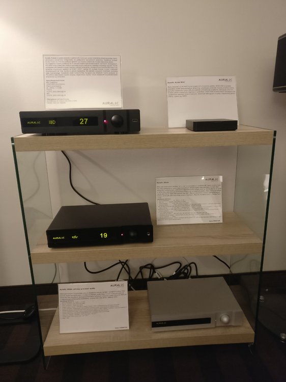 Kilka zdjęć ze stoiska wystawowego Auralica. Na wyróżnienie zasługuje połączenie ze szwajcarskimi kolumnami Piega - świetne kolumny. Precyzyjne, kiedy trzeba delikatne, a kiedy trzeba potrafią dać nieźle popalić. Oczywiście nie zabrakło nowości Auralic Altair