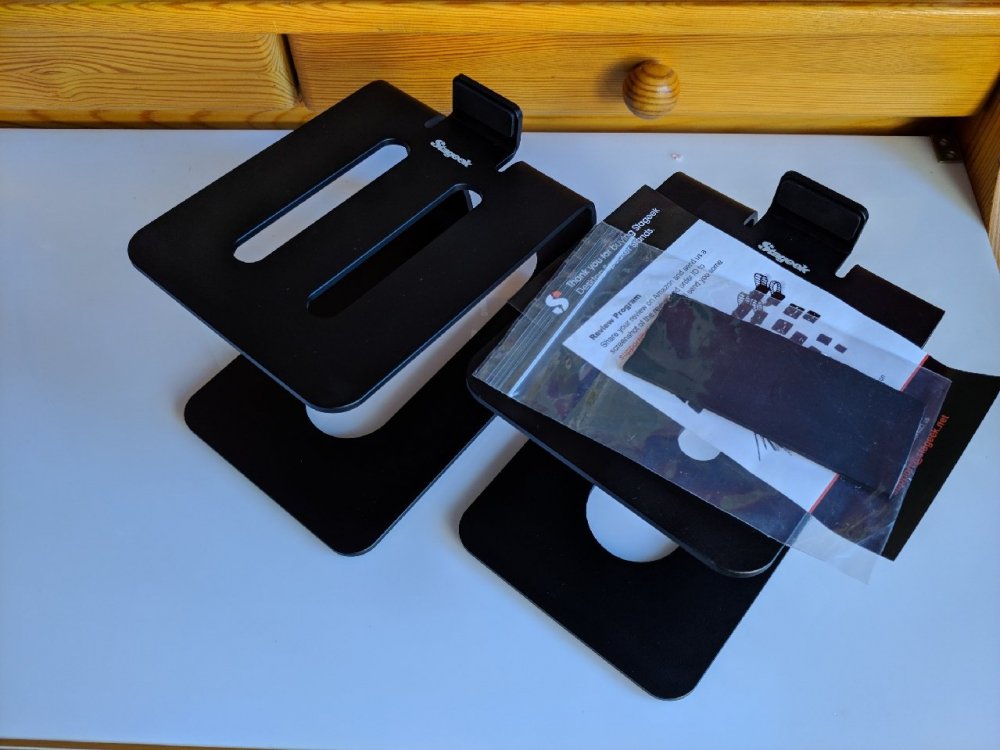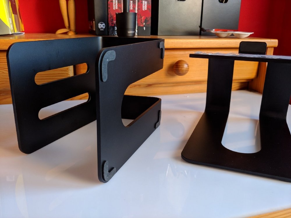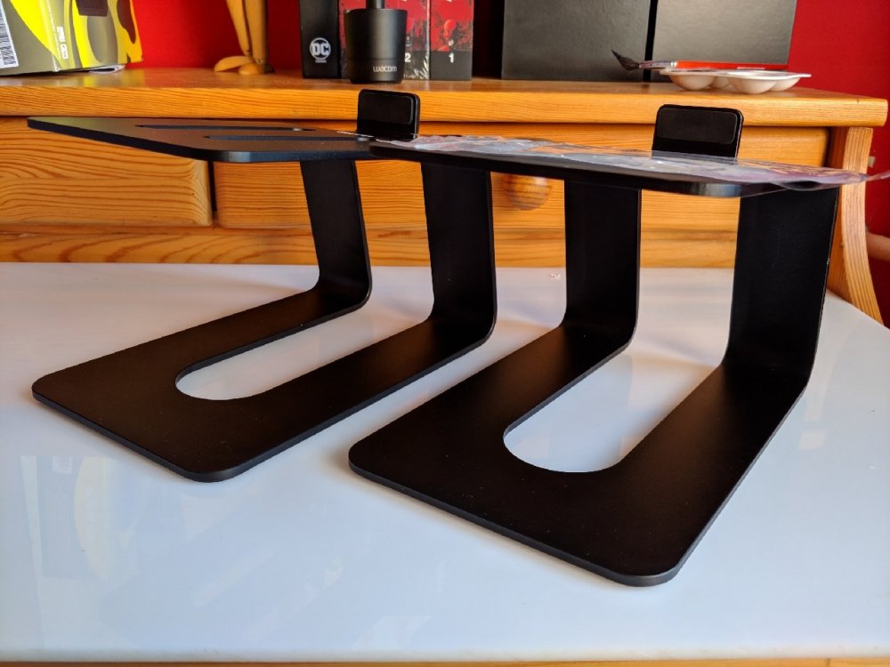 Witam. Do sprzedania biurkowe standy pod głośniki, wykonane z aluminium. Podstawki w idealnym stanie, przeznaczone pod małe i średnie głośniki/monitory. Wymiary: - wysokość: 12 cm - głębokość góra: 16 cm - głębokość dół: 19 cm - szerokość: 13 cm Cena: 200 zł - kurier w cenie. Oferty na PW.