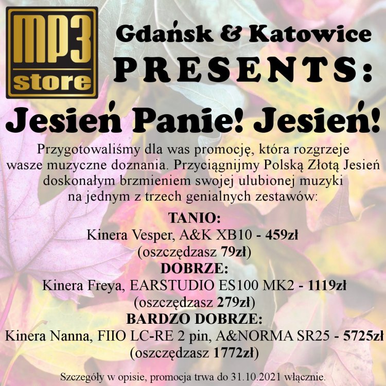 Jesienna pogoda przyniosła nie tylko grzyby, jabłka i kasztany, ale też promocję i to gorącą! Katowice łączą siły z Gdańskiem tworząc dla was trzy niesamowite zestawy audio, dla każdego coś dobrego w sam raz na długie spacery i chłodne wieczory. Wybierzcie jedną z trzech doskonałych propozycji stworzonych przez nasz zespół profesjonalistów i odkryjcie na nowo swoją ulubioną muzykę. Skontaktuj się z naszym sklepem w Katowicach, aby poznać więcej szczegółów! Pełny regulamin promocji: - promocji nie można łączyć z innymi ofertami specjalnymi, rabatami oraz promocjami - promocja dotyczy wyłącznie klientów, którzy w celu zamówienia bezpośrednio skontaktują się z katowickim lub gdańskim oddziałem mp3store (telefonicznie, mailowo lub stacjonarnie) - rezerwacja sprzętu w sklepie stacjonarnym wynosi maksymalnie 3 dni kalendarzowe - czas przetworzenia zamówienia oraz ewentualnej wysyłki może być różny w zależności od dostępności wybranych produktów - oferta nie obejmuje kosztów dostawy - liczba promocyjnych zestawów jest ograniczona, a podczas składania zamówienia liczy się kolejność zgłoszeń - sieć mp3store zastrzega sobie prawo do anulowania lub zmiany promocji bez wcześniejszego powiadomienia - oferta jest ważna do 31 października 2021r. lub do wyczerpania zapasów - w przypadku wyczerpania zapasów zastrzegamy sobie również prawo do możliwości niezrealizowania zamówienia Powyższa oferta ma charakter informacyjny i nie stanowi oferty handlowej w rozumieniu art. 66 §1, art. 66(1) §1 Kodeksu Cywilnego.