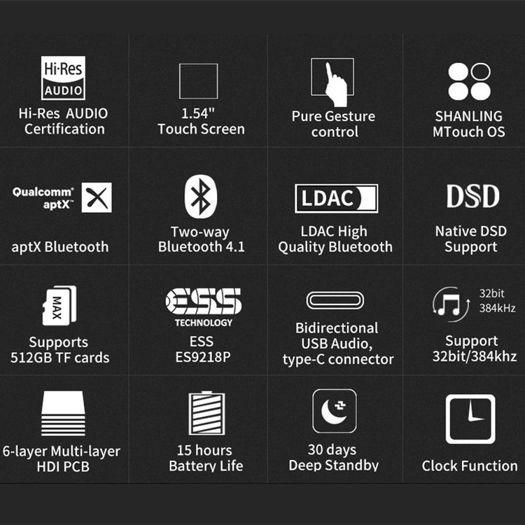 Nowość od Shanlinga.. M0 Portable Music Player Specification size: 40*135*45mm Screen: 1.54 inch 240*240 high definition touch screen Weight: about 33g DAC model: ESS Sabre ES9218P Endurance: about 15 hours (depending on the use) Deep standby: about 30 days (depending on the situation) Charging time: about 2 hours (depending on the use) Battery capacity: 640mAH lithium battery Storage: maximum support 512G TF Card (to buy) Output port: headset output (3.5 mm) Output power: 80mw@ 32 Europe Output impedance: 0.16 Europe Channel separation degree: 70dB Recommended earphone impedance: 8-300 Europe Frequency effect: 20HZ~20KHz (-0.5dB) Distortion: 0.004% (A-Weighting, output 500mV) Signal to noise ratio: 118dB (A-Weighting) Bottom noise: <3uV (HIGH GAIN) Cena w PRE-ORDERZE: 105$