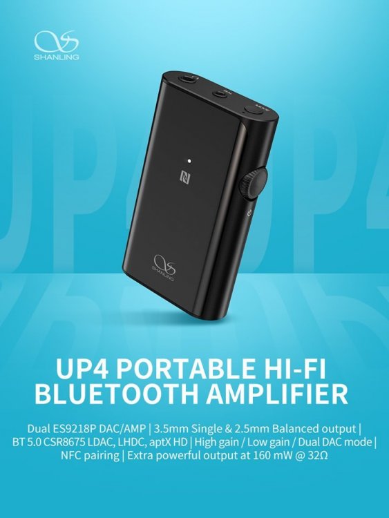 Shanling UP2 jest całkiem niezły, więc warto chyba zainteresować się również modelem UP4. Dostępny ma być w grudniu, a jego cena może oscylować na poziomie 449 zł (z tego co udało mi się dowiedzieć). Moc robi wrażenie, i to nie tylko w kategorii sprzętu BT. Kluczowe elementy specyfikacji Shanling UP4:- podwójny DAC/AMP ES9218P- Low gain i High gain oraz tryb Dual DAC; - 91 mW przy 32 omach dla single ended; - 160 mW przy 32 omach dla połączenia zbalansowanego; - parowanie NFC; - Bluetooth 5.0 (układ Qualcomm CSR8675); - kodeki LDAC, HWA LHDC, aptX HD, aptX Low Latency, aptX, AAC i SBC; - etui z klipsem w zestawie; - wielofunkcyjne pokrętło do sprzętowego kontrolowania głośności i funkcji odtwarzania; - wbudowany mikrofon (obsługa połączeń i asystentów głosowych); - funkcja DAC-a po USB (po wpięciu do komputera); - czas pracy na baterii: do 15 godz. (SE) i do 10 godz. (balanced).