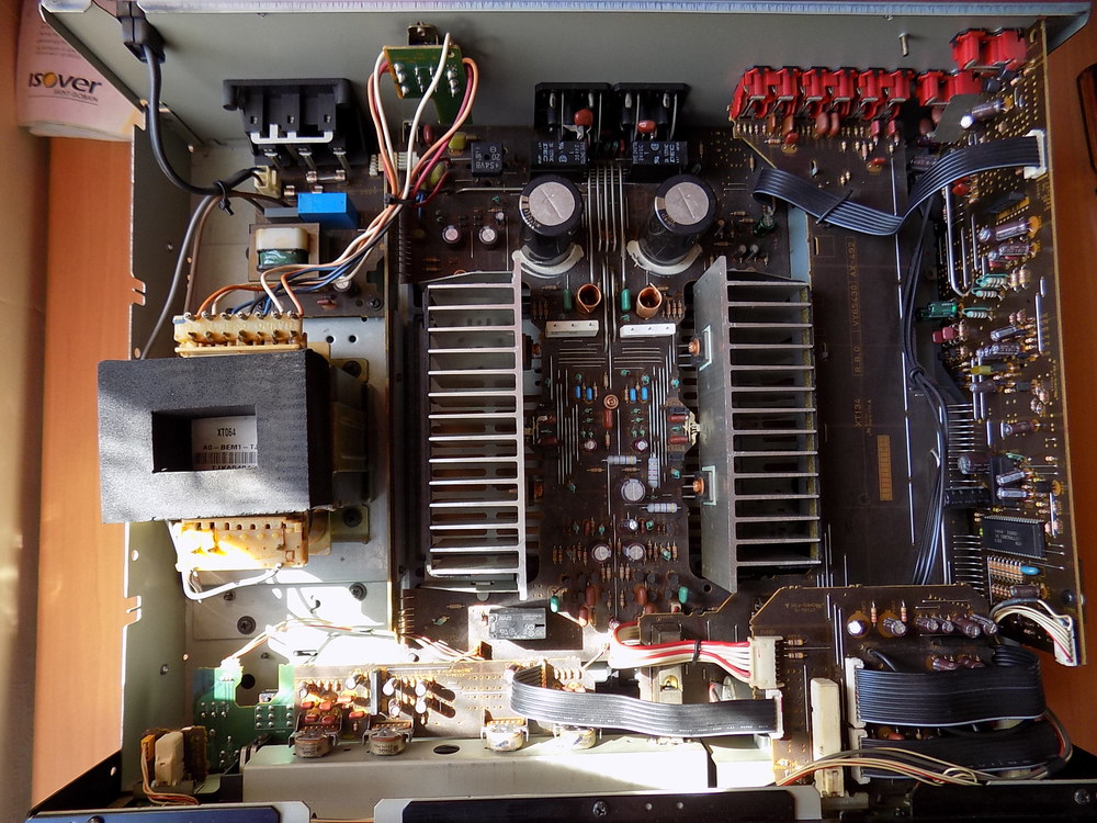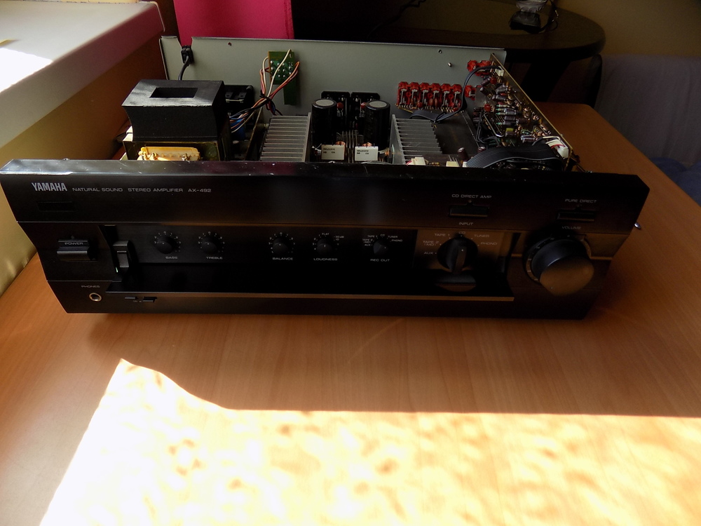 Proszę forumowiczów o próbę zdiagnozowania sytuacji. W momencie włączania wzmacniacza YAMAHA AX-492 nastąpił jednorazowy błysk widoczny po jego lewej stronie (widziałem wyraźnie przez kratkę w obudowie od góry) i przestał w ogóle się włączać (choć zapala się dioda przy przycisku POWER, natomiast diody po prawej stronie przy przyciskach CD DIRECT AMP i PURE DIRECT nie zapalają się). Mam pewne podejrzenia co do tego, co mogło się zepsuć, ale chciałbym je zweryfikować. Być może uda się po wyglądzie elementów na układach scalonych ustalić uszkodzone elementy. Załączam zdjęcia poglądowe oraz 3 dokładniejsze zdjęcia układów po lewej stronie wzmacniacza.