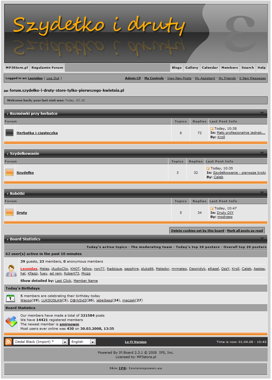 KHRoN Posted April 1, 2008 Author Report Posted April 1, 2008 Cóż... to chyba koniec pierwszokwietniowej instalacji "zajęte przez spartan forum.szydełkoidrutystore.pl" Tradycyjnie nowa skórka zostaje, można ją sobie wybrać w ustawieniach (albo wybrać domyślną - którą kto woli). ... ale Leonidas i Abministrator świstak jeszcze na forum chwilę zostaną